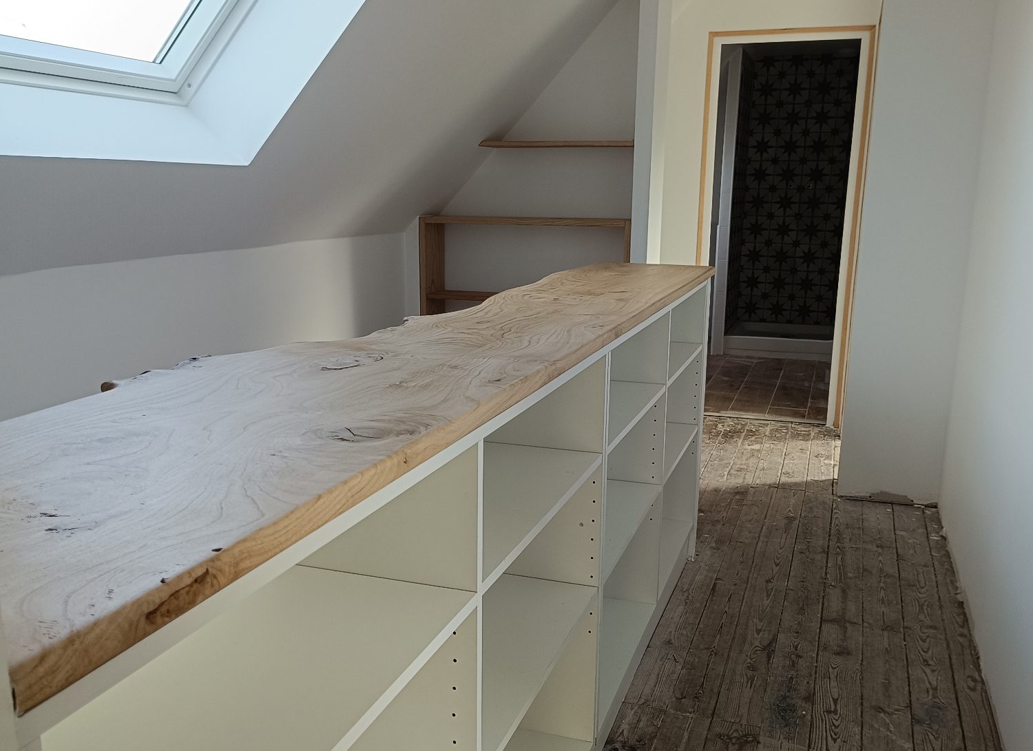 Dessin de mobilier intégré avec cette bibliothèque / Garde-corps. Plan en châtaignier écorcé.